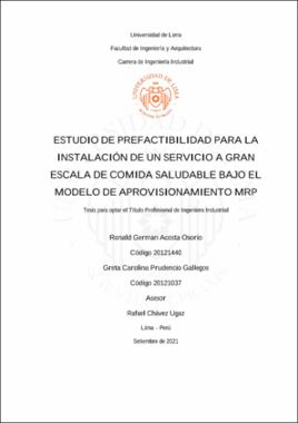 Acosta Osorio, R. G. y Prudencio Gallegos, G. C. (2021). Estudio de prefactibilidad para la instalación de un servicio a gran escala de comida saludable bajo el modelo de aprovisionamiento MRP [Tesis para optar el Título Profesional de Ingeniero Industrial, Universidad de Lima]. Repositorio institucional de la Universidad de Lima. https://hdl.handle.net/20.500.12724/14993Editor