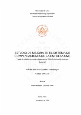 Escudero Montenegro, A. M. (2021). Estudio de mejora en el sistema de compensaciones de la empresa CMS [Trabajo de suficiencia profesional para optar el Título Profesional de Ingeniero Industrial, Universidad de Lima]. Repositorio institucional de la Universidad de Lima. https://hdl.handle.net/20.500.12724/14994Editor