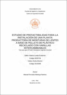 Landa Gutierrez, D. V. y Ocola Alvarez, V. (2021). Estudio de prefactibilidad para la instalación de una planta productora de monturas de lentes a base de pellets de plástico reciclado con varillas intercambiables [Tesis para optar el Título Profesional de Ingeniero Industrial, Universidad de Lima]. Repositorio institucional de la Universidad de Lima. https://hdl.handle.net/20.500.12724/15004Editor