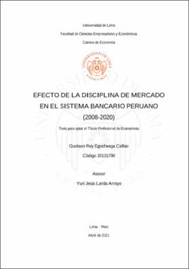 El estudio de la disciplina de mercado es un área poco explorada en el Perú. Existen diversos estudios aplicados a los sistemas bancarios de Estados Unidos y Europa; sin embargo, se han realizado pocos estudios para el caso de Perú y Latinoamérica, por lo cual este caso intenta aportar mayor conocimiento frente a un tema poco difundido de unos de los pirales de las normas de regulación bancaria de Basilea. Esta investigación estudia la relación y efecto de la disciplina de mercado en el sistema bancario peruano a través de los principales indicadores financieros de acuerdo a la metodología CAMEL de los principales bancos del país, junto con la tasa de interés pasiva y los depósitos totales del sistema bancario peruano. Asimismo, se busca analizar también el efecto de las variables macroeconómicas como el crecimiento del PBI, inflación, tipo de cambio, tasa de depreciación y la preferencia por la liquidez. Se analizarán las variables mencionadas para el periodo 2008 – 2020 mediante un análisis econométrico de panel de datos con dos ecuaciones para medir el impacto de la disciplina de mercado en la tasa de interés pasiva y la variación de depósitos totales a través de la aplicación de Efectos Fijos y Aleatorios. Los resultados sugieren que existe disciplina de mercado a través de los indicadores de Liquidez y Eficiencia; es decir, que los depositantes se enfocan en si un banco posee liquidez en caso decidan retirar su dinero y si un banco es eficiente en sus gastos administrativos para evaluar si una entidad es riesgosa o no. De esta forma, los depositantes del sistema bancario podrían exigir tasas de interés más altas por sus depósitos. Finalmente, se proponen recomendaciones para el sistema financiero enfocadas en promover más la disciplina de mercado. The study of market discipline is an area that have not yet been totally explored in Peru. There are many studies applied to the banking systems of the United States and Europe; however, just a few studies have been carried out for the case of Peru and Latin America, which is why this investigation attempt to provide more evidence about a topic that is not widely known of one of the pillars of the Basel banking regulation. This research studies the relationship and effect of market discipline in the Peruvian banking system through the analysis of main financial indicators according to the CAMEL methodology of the main banks in the country, along with the deposit interest rate and total deposits of the Peruvian banking system. Furthermore, the aim is to analyze the effect of macroeconomic variables such as GDP growth, inflation, exchange rate, depreciation rate, and preference for liquidity. The variables for the period 2008 - 2020 will be analyzed through an econometric analysis of data panel with two equations to measure the impact of market discipline on the deposit interest rate and the variation of total deposits, through the application of Fixed Effects and Random Effects methodology. Findings suggest that there is market discipline through the Liquidity and Efficiency indicators. This means, depositors focus on whether a bank has liquidity in case they decide to withdraw their money, and if a bank is efficient in its administrative expenses to assess whether an entity is risky or not. In this way, depositors in the banking system could demand higher interest rates on their bank deposits. Finally, recommendations are proposed for the financial system focused on promoting the market discipline in the country.