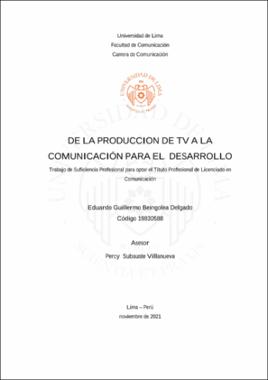 Beingolea Delgado, E. G. (2021). De la producción de TV a la comunicación para el desarrollo [Trabajo de suficiencia profesional para optar el Título Profesional de Licenciado en Comunicación, Universidad de Lima]. Repositorio Institucional de la Universidad de Lima. https://hdl.handle.net/20.500.12724/15032Editor