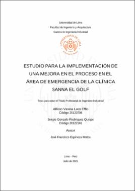 Leon Effio, A. V. y Rodriguez Quispe, S. G. (2021). Estudio para la implementación de una mejora en el proceso en el área de emergencia de la clínica SANNA El Golf [Tesis para optar el Título Profesional de Ingeniero Industrial, Universidad de Lima]. Repositorio institucional de la Universidad de Lima. https://hdl.handle.net/20.500.12724/15038Editor
