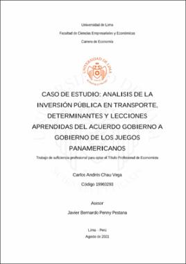 Chau Vega, C. A. (2021) Caso de estudio: análisis de la inversión pública en transporte, determinantes y lecciones aprendidas del acuerdo gobierno a gobierno de los Juegos Panamericanos [Trabajo de suficiencia profesional para optar el Título Profesional de Economista, Universidad de Lima]. Repositorio institucional de la Universidad de Lima. https://hdl.handle.net/20.500.12724/15040Editor
