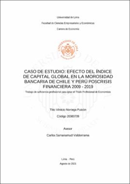 Noriega Puicón T. V. (2021) Caso de estudio: efecto del índice de capital global en la morosidad bancaria de Chile y Perú poscrisis financiera 2009 – 2019 [Trabajo de suficiencia profesional para optar el Título Profesional de Economista, Universidad de Lima]. Repositorio institucional de la Universidad de Lima. https://hdl.handle.net/20.500.12724/15062Editor