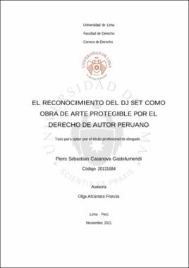 crafted by the author to the National Copyright and Neighboring Rights Registry, among other considerations of theoretical order. In addition, it recognizes the DJ Set as an expression of the liberty of artistic creation, and a manifestation of the exercise of the fundamental right of cultural access. Finally, it concludes by proposing two (02) modifications to the Peruvian Author’s Rights Act (Legislative Decree 822): First, the inclusion of a definition of the sine qua non requirement of originality, in terms of creativity; and second; the addition of a new concept of a generic protectable work to the enunciative list of the Legislative Decree 822 – the remix. La presente tesis gira en torno a la protegibilidad del DJ Set como obra de arte por el Derecho de Autor peruano, dado que en la práctica se trata de una obra cuya creación implica el uso de fonogramas musicales de terceros titulares distintos a la persona del disyóquey, sin que éste cuente con la autorización expresa y por escrito de aquéllos. En tal sentido, y en aras de contar con una base teórica sólida, inicia analizando la doctrina, legislación y jurisprudencia extranjeras sobre materias íntimamente ligadas al DJ Set, como por ejemplo el sampling, tanto desde el punto de vista del copyright anglosajón como del Derecho de Autor de Europa continental. Posteriormente, subsume al DJ Set en el ordenamiento jurídico nacional como compilación, toda vez que en el proceso de investigación se realizó un trabajo de campo satisfactorio consistente en solicitar la inscripción al Registro Nacional de Derecho de Autor y Derechos Conexos de un DJ Set creado por el autor, entre otras consideraciones de orden teórico. Además, reconoce al DJ Set como expresión de la libertad de creación artística y manifestación del ejercicio del derecho fundamental de acceso a la cultura. Para finalizar, concluye proponiendo dos (02) modificaciones a la Ley sobre el Derecho de Autor (Decreto Legislativo 822°): Primero, incluir una definición del requisito sine qua non de originalidad, en términos de creatividad; y segundo; añadir expresamente un nuevo concepto de obra genérica protegible al listado enunciativo del Decreto Legislativo 822° – la obra remix.