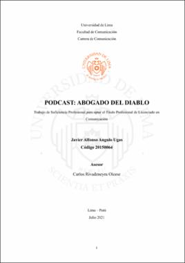 Angulo Ugas, J. A. (2021) Podcast: abogado del diablo [Trabajo de suficiencia profesional para optar el Título Profesional de Licenciado en Comunicación, Universidad de Lima]. Repositorio institucional de la Universidad de Lima. https://hdl.handle.net/20.500.12724/15093Editor