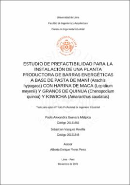 Estudio de prefactibilidad para la instalación de una planta productora de barras energéticas a base de pasta de maní (Arachis hypogaea) con harina de maca (Lepidium meyenii) y granos de quinua (Chenopodium quinoa) y kiwicha (Amaranthus caudatus)