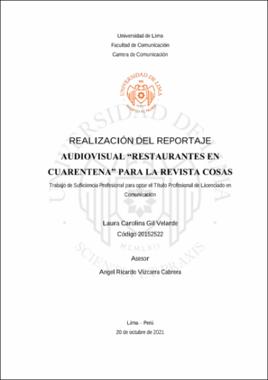 El proyecto audiovisual Restaurantes en cuarentena tiene por objetivo explorar y plasmar cómo restaurantes limeños fueron afectados por la pandemia de la COVID-19 y el esfuerzo de reactivación. Fue hecho para el público digital de la revista Cosas. Es una serie web que consiste en tres capítulos que recogen las experiencias de dueños de distintos restaurantes durante el periodo de aislamiento obligatorio en el Perú a lo largo del 2020. Los reportajes fueron hechos enteramente de forma remota; las entrevistas se hicieron por una plataforma digital de videollamada y el material de apoyo se recogió del contenido que los propios negocios usan en sus redes sociales. El trabajo demuestra la posibilidad de crear reportajes audiovisuales de calidad sin la necesidad de ejecutar una grabación presencial, usando las ventajas de la virtualidad. The audiovisual project “Restaurantes en cuarentena” explores and captures how restaurants of Lima were affected by the COVID-19 pandemic and their reactivation effort. It was made for the digital audience of revista Cosas. It is a web series that consists of three chapters that collect the experiences of different restaurant owners during the quarantine period in Peru during 2020. The videos were filmed entirely remotely; the interviews were done through a digital video call platform and the B-roll material was collected from the content that the businesses themselves use on their social media networks. This project demonstrates the possibility of creating quality audiovisual content without the need to perform a face-to-face recording, using the advantages of virtuality.