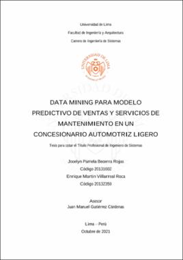 Becerra Rojas, J.P. y Villarreal Roca, E.M. (2021). Data Mining para modelo predictivo de ventas y servicios de mantenimiento en un concesionario automotriz ligero [Tesis para optar el Título Profesional de Ingeniero de Sistemas, Universidad de Lima]. Repositorio institucional de la Universidad de Lima.https://hdl.handle.net/20.500.12724/15395Editor