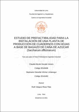 Decada Venero, C. N. y Vilchez Urdanegui, S. G. (2021). Estudio de prefactibilidad para la instalación de una planta de producción de cuadernos con hojas a base de bagazo de caña de azúcar (Saccharum officinarum) [Tesis para optar el Título Profesional de Ingeniero Industrial, Universidad de Lima]. Repositorio institucional de la Universidad de Lima. https://hdl.handle.net/20.500.12724/15618Publisher