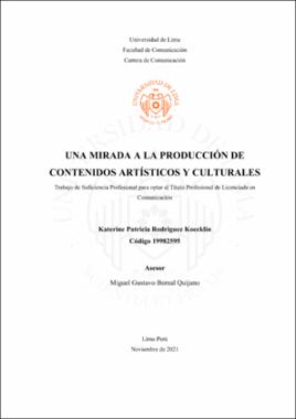 Rodriguez Koecklin, K.P. (2021). Una mirada a la producción de contenidos artísticos y culturales [Trabajo de suficiencia profesional para optar el Título Profesional de Licenciado en Comunicación, Universidad de Lima]. Repositorio Institucional de la Universidad de Lima.https://hdl.handle.net/20.500.12724/15656Editor