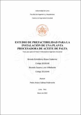 Bravo Gutierrez, B. E. y Leon Villafuerte, B. S. (2022). Estudio de prefactibilidad para la instalación de una planta procesadora de aceite de palta [Tesis para optar el Título Profesional de Ingeniero Industrial, Universidad de Lima]. Repositorio institucional de la Universidad de Lima. https://hdl.handle.net/20.500.12724/15769Editor