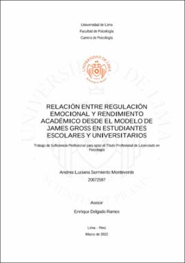 Sarmiento Monteverde, A.L. (2022). Relación entre regulación emocional y rendimiento académico desde el modelo de James Gross en estudiantes escolares y universitarios [Trabajo de suficiencia profesional para optar el Título Profesional de Licenciado en Psicología, Universidad de Lima]. Repositorio institucional de la Universidad de Lima.https://hdl.handle.net/20.500.12724/15816Editor