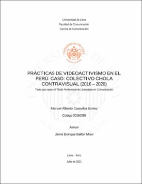 Casavilca Gomez, M. A. (2021). Prácticas de videoactivismo en el Perú. Caso: colectivo Chola Contravisual (2016 – 2020) [Tesis para optar el Título Profesional de Licenciado en Comunicación, Universidad de Lima]. Repositorio Institucional de la Universidad de Lima.https://hdl.handle.net/20.500.12724/16005Editor