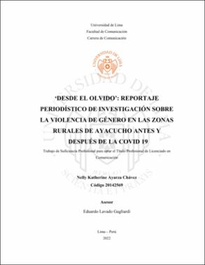 Ayarza Chávez, N.K. (2022). 'Desde el olvido': reportaje periodístico de investigación sobre la violencia de género en las zonas rurales de Ayacucho antes y después de la COVID 19 [Trabajo de suficiencia profesional para optar el Título Profesional de Licenciado en Comunicación, Universidad de Lima]. Repositorio Institucional de la Universidad de Lima. https://hdl.handle.net/20.500.12724/16196Editor