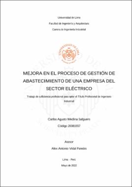 Medina Salguero, C. A. (2022). Mejora en el proceso de gestión de abastecimiento de una empresa del sector eléctrico [Trabajo de suficiencia profesional para optar el Título Profesional de Ingeniero Industrial, Universidad de Lima]. Repositorio institucional de la Universidad de Lima. https://hdl.handle.net/20.500.12724/16224Editor