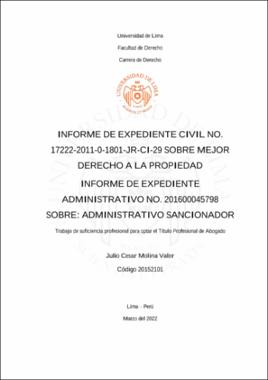 Informe de Expediente Civil No. 17222-2011-0-1801-JR-CI-29 Sobre Mejor Derecho a la Propiedad. Informe de Expediente Administrativo No. 201600045798 Sobre: Administrativo Sancionador