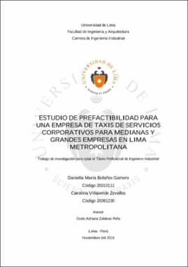 Bolaños Gamero, D. M. y Villaverde Zevallos, C. (2016). Estudio de prefactibilidad para una empresa de taxis de servicios corporativos para medianas y grandes empresas en Lima Metropolitana [Trabajo de investigación para optar el Título Profesional de Ingeniero Industrial, Universidad de Lima]. Repositorio institucional de la Universidad de Lima. https://hdl.handle.net/20.500.12724/16300Editor