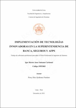 Sakuma Carbonel, I. H. J. (2021). Implementación de tecnologías innovadoras en la Superintendencia de Banca, Seguros y AFPS [Trabajo de suficiencia profesional para optar el Título Profesional de Ingeniero de Sistemas, Universidad de Lima]. Repositorio Institucional de la Universidad de Lima. https://hdl.handle.net/20.500.12724/16316Editor