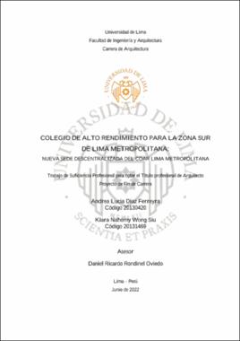Diaz Ferreyra, A. L. y Wong Siu, K. N. (2022) Colegio de Alto Rendimiento para la zona sur de Lima Metropolitana: nueva sede descentralizada del COAR Lima Metropolitana [Trabajo de suficiencia profesional para optar el Título Profesional de Arquitecto, Universidad de Lima]. Repositorio Institucional de la Universidad de Lima. https://hdl.handle.net/20.500.12724/16324Editor