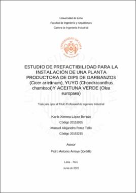 López Beraún, K. X. y Perez Tello, M. A. (2022). Estudio de prefactibilidad para la instalación de una planta productora de dips de garbanzos (Cicer arietinum), yuyo (Chondracanthus chamissoi) y aceituna verde (Olea europaea) [Tesis para optar el Título Profesional de Ingeniero Industrial, Universidad de Lima]. Repositorio institucional de la Universidad de Lima. https://hdl.handle.net/20.500.12724/16341Editor