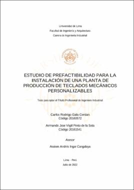 Gala Cerdan, C. R. y Vigil Pinto de la Sota, A. J. (2022). Estudio de prefactibilidad para la instalación de una planta de producción de teclados mecánicos personalizables [Tesis para optar el Título Profesional de Ingeniero Industrial, Universidad de Lima]. Repositorio institucional de la Universidad de Lima. https://hdl.handle.net/20.500.12724/16451Editor