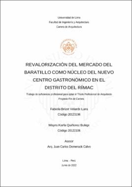 Quiñonez Bulege, M. K. y Verlarde Lara, F. B. (2022). Revalorización del mercado del Baratillo como núcleo del nuevo centro gastronómico en el distrito del Rímac [Trabajo de suficiencia profesional para optar el Título Profesional de Arquitecto, Universidad de Lima]. Repositorio Institucional de la Universidad de Lima. https://hdl.handle.net/20.500.12724/16476Editor