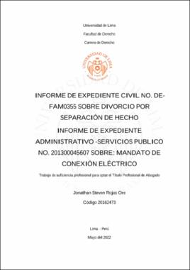 Rojas Ore, J. S. (2022). Informe de expediente civil No. DE-FAM0355 Sobre divorcio por separación de hecho. Informe de expediente administrativo -servicios público No. 201300045607 Sobre: Mandato de conexión eléctrico [Trabajo de suficiencia profesional para optar el Título Profesional de Abogado, Universidad de Lima]. Repositorio institucional de la Universidad de Lima. https://hdl.handle.net/20.500.12724/16535Editor