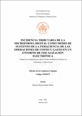 Espinoza Céspedes, A. J. (2022). Incidencia tributaria de la microforma digital como medio de sustento de la fehaciencia de las operaciones de costo y gasto en un entorno de fiscalización electrónica [Trabajo de Investigación para optar el Grado Académico de Maestro en Tributación y Política Fiscal, Universidad de Lima]. Repositorio Institucional de la Universidad de Lima. https://hdl.handle.net/20.500.12724/16833Editor