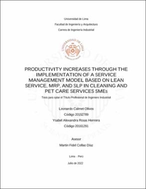 Calmet Olivos, L. & Rosas Herrera, Y. A. (2022). Productivity increases through the implementation of a service management model based on Lean Service, MRP, and SLP in cleaning and pet care services SMEs [Tesis para optar el Título Profesional de Ingeniero Industrial, Universidad de Lima]. Repositorio institucional de la Universidad de Lima. https://hdl.handle.net/20.500.12724/17169Editor