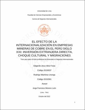 El propósito de la presente investigación fue recolectar y analizar información sobre el efecto de la internacionalización en las empresas mineras de cobre en el Perú durante el periodo 2011-2019, en lo concerniente a inversión extranjera directa (IED), migración externa de trabajadores y choque cultural interno. Para la cual se revisó la bibliografía correspondiente, estudios similares y se encuestó a una muestra representativa de 21 directores, gerentes y/o jefes de las áreas de finanzas, logística, recursos humanos, producción entre otras, de las cinco principales empresas productoras de cobre en el Perú; el instrumento utilizado fue un cuestionario. Se determinó que los factores económicos, políticos y sociales influyen en el incremento de la inversión extranjera directa de empresas mineras de cobre en el Perú, así como las migraciones, lo que genera un choque cultural interno en las empresas; la inversión extranjera directa en minería de cobre en el Perú genera beneficios económicos, sociales, aumenta el choque cultural interno y las migraciones. Los principales resultados obtenidos fueron que: los factores más importantes a la hora de seleccionar un país para invertir en un proyecto minero de cobre son la existencia del mineral, estabilidad macroeconómica, facilidad para obtener autorizaciones gubernamentales, entre otros. Por último, uno de los resultados más importantes fue que todas las empresas planean realizar nuevas inversiones en los próximos 10 años. A manera de conclusión, podemos afirmar que la internacionalización de empresas mineras de cobre de capital extranjero en el Perú durante el período 2011-2019 tiene un efecto en la inversión extranjera directa, la migración de trabajadores y a su vez genera un choque cultural interno. The purpose of this research was to collect and analyze information on the effect of internationalization on copper mining companies in Peru during the period 2011-2019, regarding foreign direct investment, external migration of workers and internal cultural shock. For which the corresponding bibliography and similar studies were reviewed. A representative sample of 21 directors, managers and/or heads of the areas of finance, logistics, human resources, production, among others, of the five main copper producing companies in Peru, were surveyed. The instrument used was a questionnaire. It was determined that economic, political, and social factors influence the increase in foreign direct investment in copper mining companies in Peru, as well as migration, which generates an internal cultural shock in companies; Foreign direct investment in copper mining in Peru generates economic and social benefits, increases internal culture shock, and migration. The most relevant results obtained were that the most important factors when choosing a country to invest in a copper mining project are mineral existence, macroeconomic stability, ease of obtaining government authorizations, among others. One of the most important results was that all the companies plan to make new investments in the next ten years. We can conclude that the internationalization of foreign capital copper mining companies in Peru during the 2011-2019 period affects foreign direct investment as well as the migration of workers and at the same time generates an internal cultural shock.