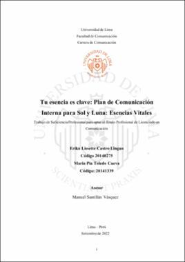 Castro Lingan, E.L. & Toledo Cueva, M.P. (2022). Tu esencia es clave: plan de comunicación interna para Sol y Luna: esencias vitales [Trabajo de suficiencia profesional para optar el Título Profesional de Licenciado en Comunicación, Universidad de Lima]. Repositorio Institucional de la Universidad de Lima. https://hdl.handle.net/20.500.12724/17243Editor