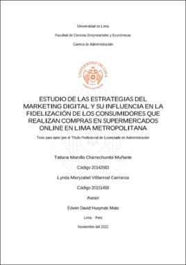 del supermercado online, es decir, influyen en la fidelización. Por último, se explican las conclusiones y recomendaciones para los supermercados online que busquen incrementar la fidelización de sus consumidores. This study aims to determine how digital marketing strategies influence consumer loyalty who make purchases in online supermarkets in Lima Metropolitana. The type of research is applied and has a quantitative approach. For this reason, for the present study, a virtual survey was carried out on 385 people over 18 years old who reside in Lima and make purchases in online supermarkets. The first chapter presents the formulation of how digital marketing strategies can influence consumer loyalty, also describes objectives, importance of the research and limitations of the study. In the second chapter, antecedents and convenient theoretical bases for the investigation are exposed. Among them, various investigations show that consumers are not satisfied with the online shopping service. In chapter three, the general and specific hypotheses and operationalization of variables under study are presented. Likewise, in chapter four, the calculation of the sample is detailed, as well as the elaboration of research instrument and statistical software that was SPPSS 26, is specified. The fifth chapter shows the results of the application of the survey with their respective graphs. The results indicate that digital marketing strategies: omnichannel, engagement and e commerce influence the repurchase of online supermarket, that is, they influence loyalty. Finally, conclusions and recommendations for online supermarkets that seek to increase the loyalty of their consumers are explained.