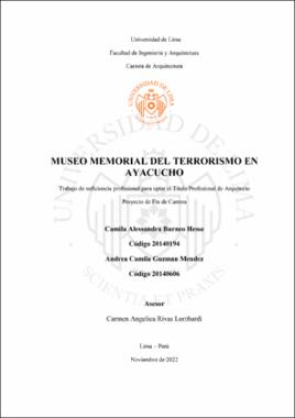 Burneo Hesse, C. A. & Guzman Mendez, A. C. (2022). Museo memorial del terrorismo en Ayacucho [Trabajo de suficiencia profesional para optar el Título Profesional de Arquitecto, Universidad de Lima]. Repositorio Institucional de la Universidad de Lima. https://hdl.handle.net/20.500.12724/17432Editor