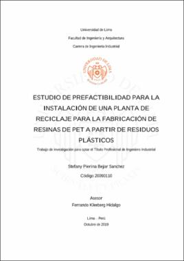 Bejar Sanchez, S. P. (2019). Estudio de prefactibilidad para la instalación de una planta de reciclaje para la fabricación de resinas de PET a partir de residuos plásticos [Trabajo de investigación para optar el Título Profesional de Ingeniero Industrial, Universidad de Lima]. Repositorio institucional de la Universidad de Lima. https://hdl.handle.net/20.500.12724/17483Editor