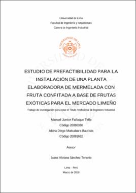 Matsubara Bautista, A. D. & Fallaque Tello, M. J. (2018). Estudio de prefactibilidad para la instalación de una planta elaboradora de mermelada con fruta confitada a base de frutas exóticas para el mercado limeño [Trabajo de investigación para optar el Título Profesional de Ingeniero Industrial, Universidad de Lima]. Repositorio institucional de la Universidad de Lima. https://hdl.handle.net/20.500.12724/17484Editor