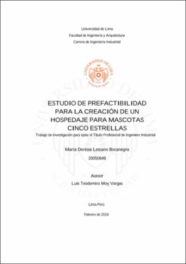 En el presente trabajo se desarrollará el estudio de prefactibilidad para determinar la viabilidad técnico-económica de un hospedaje para mascota 5 estrellas, con el fin de presentar una alternativa diferenciada en servicio vs lo que hoy en día se tiene en el mercado para cuando se requiera dejar a las mascotas en un lugar seguro y confiable. En el primer capítulo, se hace mención a los principales objetivos y la hipótesis con la que se da inicio al estudio; así también se tratan algunos puntos como las justificaciones técnicas, económicas y sociales. En segundo capítulo, se llevó a cabo el estudio de mercado para la elaboración del servicio, determinando principalmente el nivel socioeconómico A y B como mercado meta para la ejecución del proyecto. Realizando una encuesta de 365 personas se obtuvo una aprobación del 85,2 % entre las edades de 20 y 70 años. En el tercer capítulo, se analizaron las posibles ubicaciones del local. Empleando el método de ranking de factores, se evaluaron el costo y la adaptabilidad de las alternativas de localización; obteniendo como resultado el distrito de Pachacamac en el departamento de Lima. En el cuarto capítulo, se analizaron diversos factores para determinar el tamaño del local más adecuado, obteniendo como resultado la relación tamaño/tecnología con una capacidad de 32 400 servicios al año. En el quinto capítulo, se analizó el tipo de proceso y maquinaria más adecuada para obtener un servicio de calidad. Se desarrolló el diagrama de flujo del proceso para una mejor visión de todas las operaciones de cada etapa; también se revisó la disposición de planta en forma general y detallada, donde se determinó un área total de 4 300 metros cuadrados. En el sexto capítulo, se analizó el requerimiento del personal directivo, administrativo y de soporte interno del servicio, logrando conocer la cantidad de personas por puesto y las funciones a desempeñar. En el séptimo capítulo, se analizaron los aspectos económicos; detallando los costos tangibles e intangibles, así como los costos de mano de obra directa e indirecta. 2 En el octavo capítulo, se concluye que este proyecto es técnica y económicamente viable a nivel prefactibilidad al analizar los resultados obtenidos de fondos económicos y financieros, entre los cuales tenemos: • VAN y TIR económica: 124 793 y 16,66% respectivamente. • VAN y TIR financiera: 200 428 y 19,79% respectivamente.