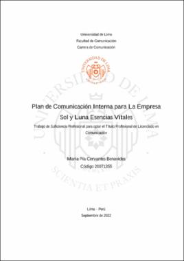 Cervantes Benavides, M.P. (2022). Plan de comunicación interna para la empresa Sol y Luna Esencias Vitales [Trabajo de suficiencia profesional para optar el Título Profesional de Licenciado en Comunicación, Universidad de Lima]. Repositorio Institucional de la Universidad de Lima. https://hdl.handle.net/20.500.12724/17504Editor