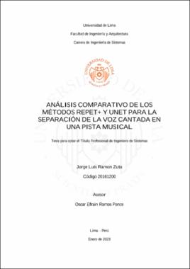 Ramon Zuta, J. L. (2023). Análisis comparativo de los métodos REPET+ y UNet para la separación de la voz cantada en una pista musical [Tesis para optar el Título Profesional de Ingeniero de Sistemas, Universidad de Lima]. Repositorio institucional de la Universidad de Lima. https://hdl.handle.net/20.500.12724/17755Editor
