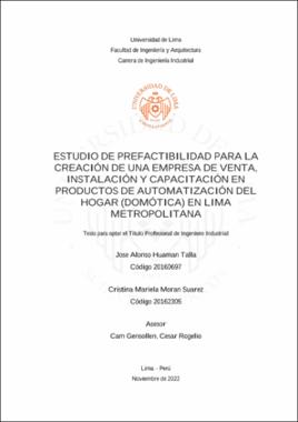In the present investigation, different models and tools that were collected throughout the Industrial Engineering career were used, these allowed to have a scientific basis for the resolution of different unknowns that arose while the project, about the domotic service, was being developed. Among the main ones we have, in first place, the market study, where the target audience was determined and the behavior of different home automation products within the Peruvian market was analyzed to, later, project their sales in a 5-year panorama (9,190 packages by 2026). In second place, there is the study for the location of the company, where techniques such as confrontation tables and factor rankings were used to determine both the department and the district where the project will be established (Lince, Lima). Third, the study related to the company's facilities was carried out, in which, thanks to the Guerchet method and the "Manual para diseño de instalaciones manufactureras y de servicios", the tentative plan of the workplace was made (occupying a total area of 198 m2). Finally, economic-financial studies were carried out, which demonstrated the profitability of the home automation service, and it was also shown that it is more beneficial to externally finance 30% of the total investment (VAN: S /. 161,040.23 and TIR > COK). En la presente investigación, se utilizaron diferentes modelos y herramientas que fueron las recopiladas a lo largo de la carrera de Ingeniería Industrial, estas permitieron tener una base científica para la resolución de diferentes incógnitas que surgieron mientras se desarrollaba el proyecto sobre el servicio de domótica. Entre las principales tenemos, en primer lugar, al estudio de mercado, donde se determinó el público objetivo y se analizó el comportamiento de diferentes productos de domótica dentro del mercado peruano para, posteriormente, proyectar las ventas de estos en un panorama de 5 años (9,190 paquetes al quinto año). En segundo lugar, se encuentra el estudio para la ubicación de la empresa, donde se utilizaron técnicas como las tablas de enfrentamiento y ranking de factores para determinar tanto el departamento como el distrito donde se establecerá el proyecto (Lince, Lima). En tercer lugar, se realizó el estudio relacionado a las instalaciones de la empresa, en el que, gracias al método de Guerchet y al “Manual para diseño de instalaciones manufactureras y de servicios”, se realizó el plano tentativo del local de trabajo (ocupando una superficie total de 198 m2 ). Por último, se realizaron los estudios económico-financieros, que demostraron la rentabilidad del servicio de domótica, además se evidenció que es más beneficioso financiar externamente el 30% de la inversión total (VAN: S/. 161,040.23 y TIR > COK).