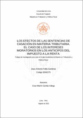 Falla Cardenas, J. A. (2022). Los efectos de las sentencias de casación en materia tributaria. El caso de los intereses moratorios en los anticipos del impuesto a la renta [Trabajo de Investigación para optar el Grado Académico de Maestro en Tributación y Política Fiscal, Universidad de Lima]. Repositorio Institucional de la Universidad de Lima. https://hdl.handle.net/20.500.12724/18038Editor