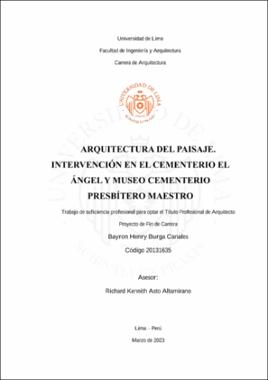 Burga Canales, B. H. (2023). Arquitectura del paisaje. Intervención en el Cementerio El Ángel y Museo Cementerio Presbítero Maestro [Trabajo de suficiencia profesional para optar el Título Profesional de Arquitecto, Universidad de Lima]. Repositorio Institucional de la Universidad de Lima. https://hdl.handle.net/20.500.12724/18179Editor