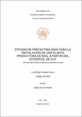 Llenque Correa, L. F. (2023). Estudio de prefactibilidad para la instalación de una planta productora de biol a partir del estiércol de cuy [Tesis para optar el Título Profesional de Ingeniero Industrial, Universidad de Lima]. Repositorio institucional de la Universidad de Lima. https://hdl.handle.net/20.500.12724/18315Editor