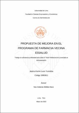 León Yurivilca, J. K. (2023) Propuesta de mejora en el programa de farmacia vecina EsSalud [Trabajo de suficiencia profesional para optar el Título Profesional de Licenciado en Administración, Universidad de Lima]. Repositorio institucional de la Universidad de Lima. https://hdl.handle.net/20.500.12724/18414Editor