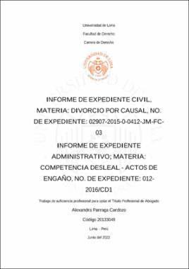 Informe de Expediente Civil, Materia: Divorcio por Causal, No. de Expediente: 02907-2015-0-0412-JM-FC-03. Informe de Expediente Administrativo; Materia: Competencia Desleal - Actos de Engaño, No. de Expediente: 012-2016/CD1