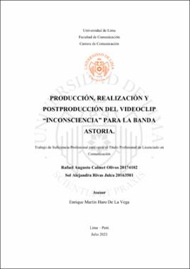 Calmet Olivos, R. A. & Rivas Julca, S. A. (2023). Producción, realización y postproducción del videoclip "Inconsciencia" para la banda Astoria [Trabajo de suficiencia profesional para optar el Título Profesional de Licenciado en Comunicación, Universidad de Lima]. Repositorio Institucional de la Universidad de Lima. https://hdl.handle.net/20.500.12724/19350Editor