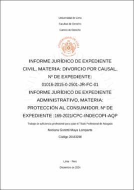Informe Jurídico de Expediente Civil, materia: Divorcio por Causal, Nº de Expediente : 01016-2015-0-2501-JR-FC-01 Informe Jurídico de Expediente Administrativo, materia: Protección al Consumidor, Nº de Expediente :169-2021/CPC-INDECOPI-AQP