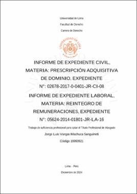 Informe de Expediente Civil, materia: Prescripción Adquisitiva de Dominio, Expediente N°: 02678-2017-0-0401-JR-CI-08 Informe de Expediente Laboral, materia: Reintegro de Remuneraciones, Expediente N°: 05624-2014-01801-JR-LA-16