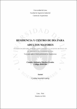 El presente proyecto, tiene como objetivo diseñar una Residencia y Centro de día para adultos mayores, interviniendo un edificio antiguo de Barrios Altos, propiedad de la Beneficencia Pública de Lima. Este, es el Hogar Geriátrico San Vicente de Paul, ubicado en la cuadra 15 del Jr. Ancash, el cual actualmente brinda atención a personas de la tercera edad en situación de abandono. Sin embargo, las condiciones en las que se encuentra, no son las más óptimas para residir a estas personas, careciendo de ambientes básicos y poniendo en peligro al usuario. Además, el estudio de la zona, ha permitido identificar los usos y el equipamiento necesario para los vecinos, los cuales han sido considerados como parte del diseño.