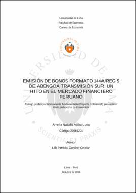 Viñas Luna, A. (2016). Emisión de bonos formato 144A/REG S de Abengoa Transmisión Sur : un hito en el mercado financiero peruano. (Trabajo de investigación para optar el Título Profesional de Economista). Universidad de LimaEditor